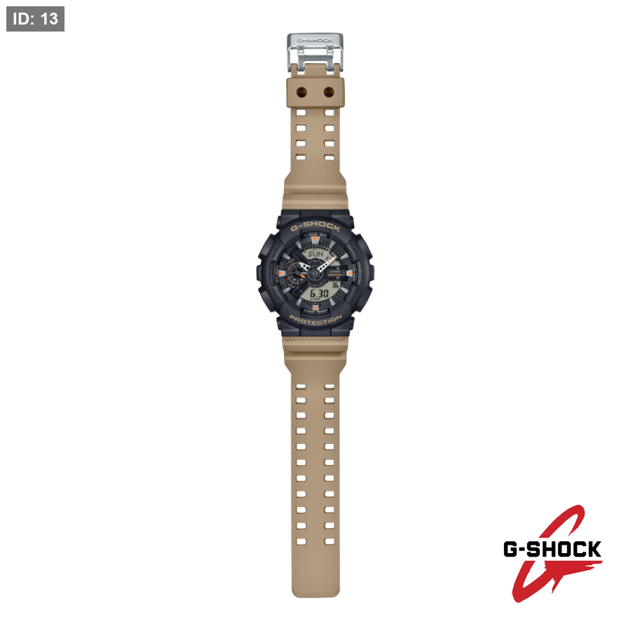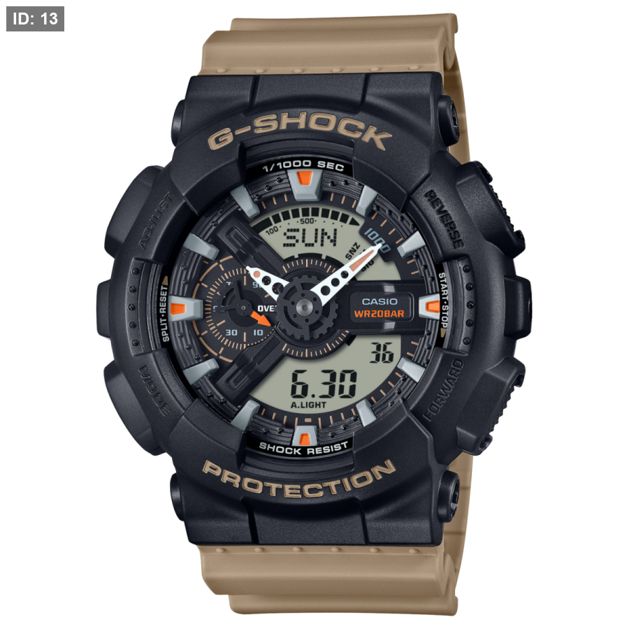 يجمع هذا الموديل بين مينا باللون الأسود وسوار باللون البيج أو الأخضر الزيتوني، لتمنحك تشكيلة الألوان الثنائية ذات الطابع العملي مظهر قطعة معدات احترافية متقنة.