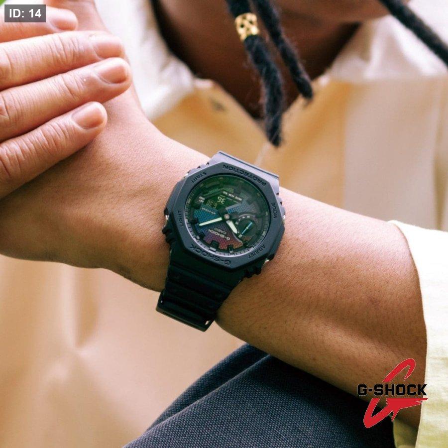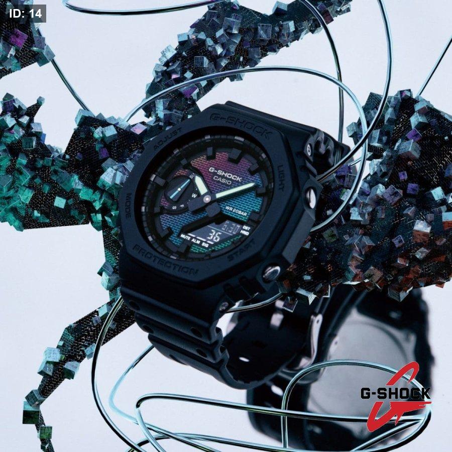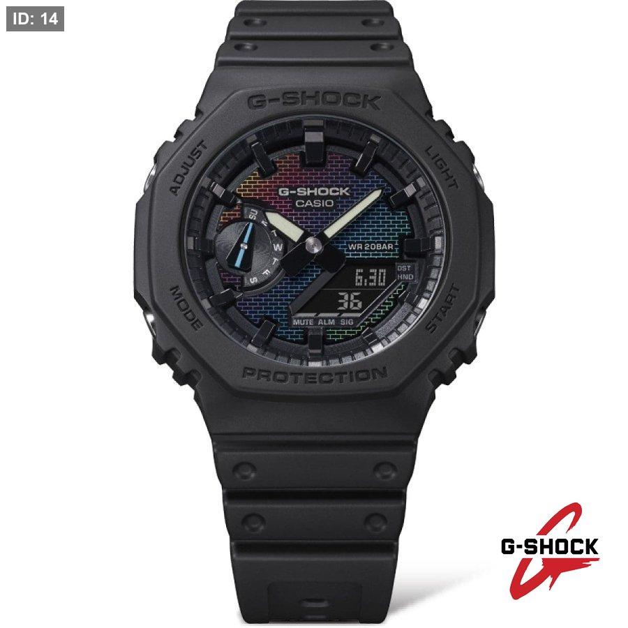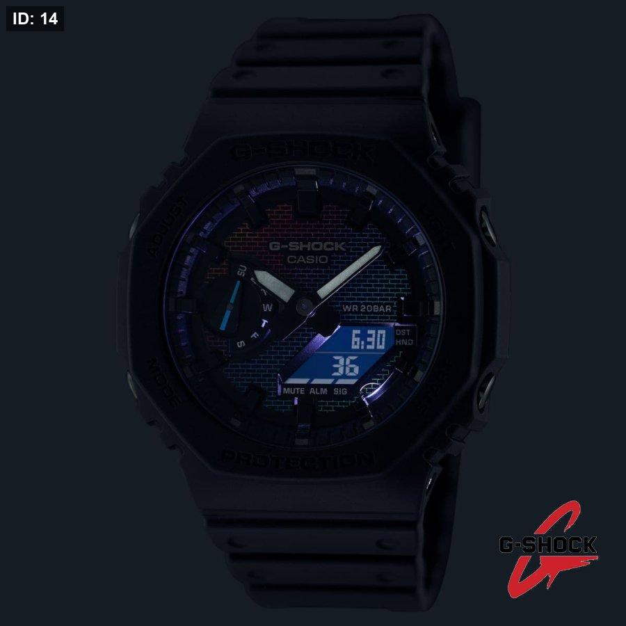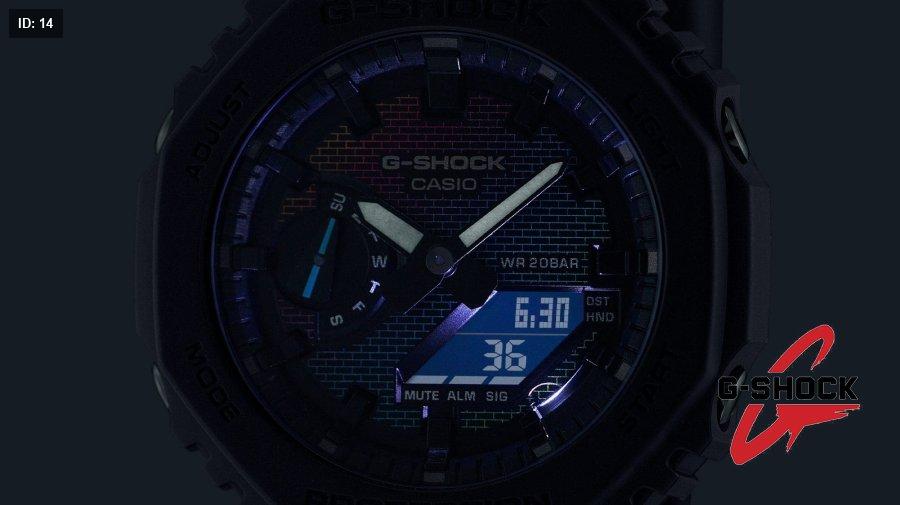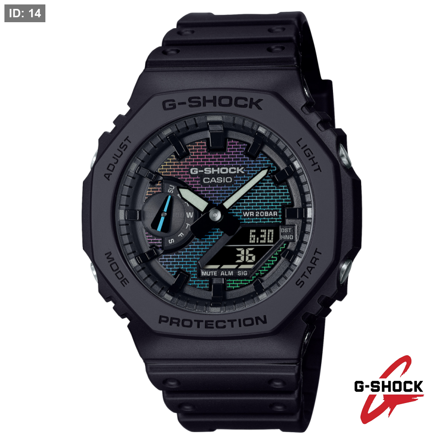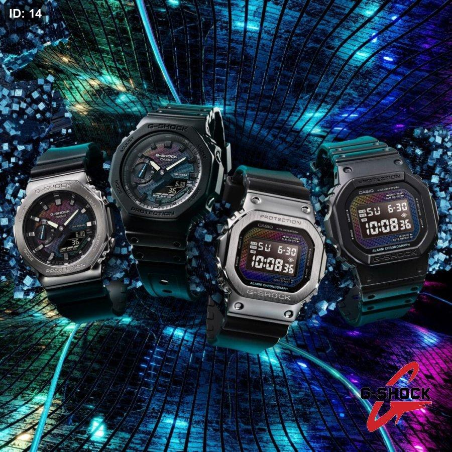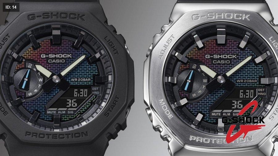 في موديلات DW-5600 وGM-5600 تأتي نقشة الجدار الملون على زجاج الساعة نفسه، بتدرجات قوس قزح عبر الطلاء البخاري. أما في موديلات GA-2100 وGM-2100 فتظهر نقشة الجدار المتلون على القرص من خلال مزيج من الطلاء الفضي بالبخار والنقش بالليزر والطباعة بألوان قوس قزح.