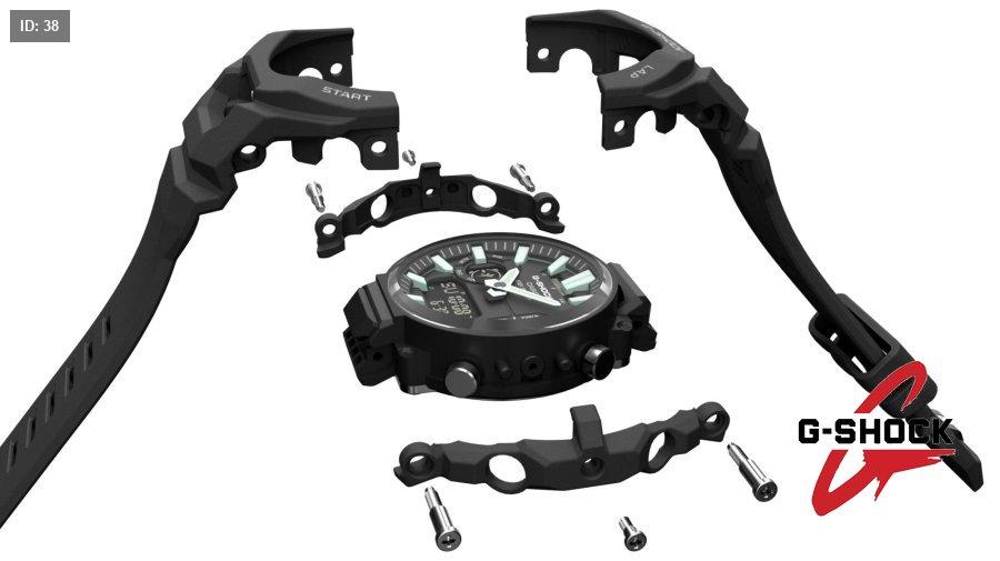 يتم تشكيل الإطار والسوار كقطعة خارجية واحدة مندمجة، مما يوفر حماية قوية للعلبة المصنوعة من ريزين مقوّى بألياف الكربون. تم تصميم السوار ليمنح أقصى درجات المرونة، ما يوفّر إحساسًا أكثر راحة على المعصم. كما أن أسلوب تثبيت الزجاج اللاصق يسمح بتصميم أكثر دمجًا عند الوصلات (Lugs)، ليُبرز انسيابية حادة وأنيقة من الإطار حتى السوار.